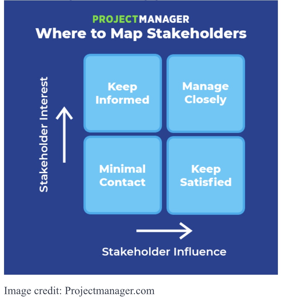 4. Plot Stakeholders on a Matrix: This involves creating a stakeholder matrix with the level of influence on one axis and the level of interest on the other. This matrix helps visualize the stakeholders’ positions and prioritize engagement efforts. Commonly, this matrix is divided into four quadrants: high power/high interest, high power/low interest, low power/high interest, and low power/low interest.