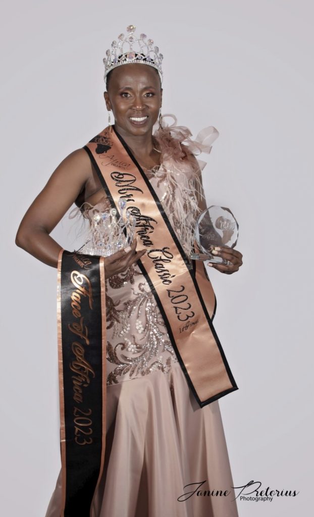 This former Mrs SA Semi-Finalist and the Mangwanani Ambassador for 2015 currently holds such multiple titles as the “Mrs Africa Classic 1st Princess 2023”, “Face of Africa 2023” and “Dignity Dreams Ambassador 2023”.