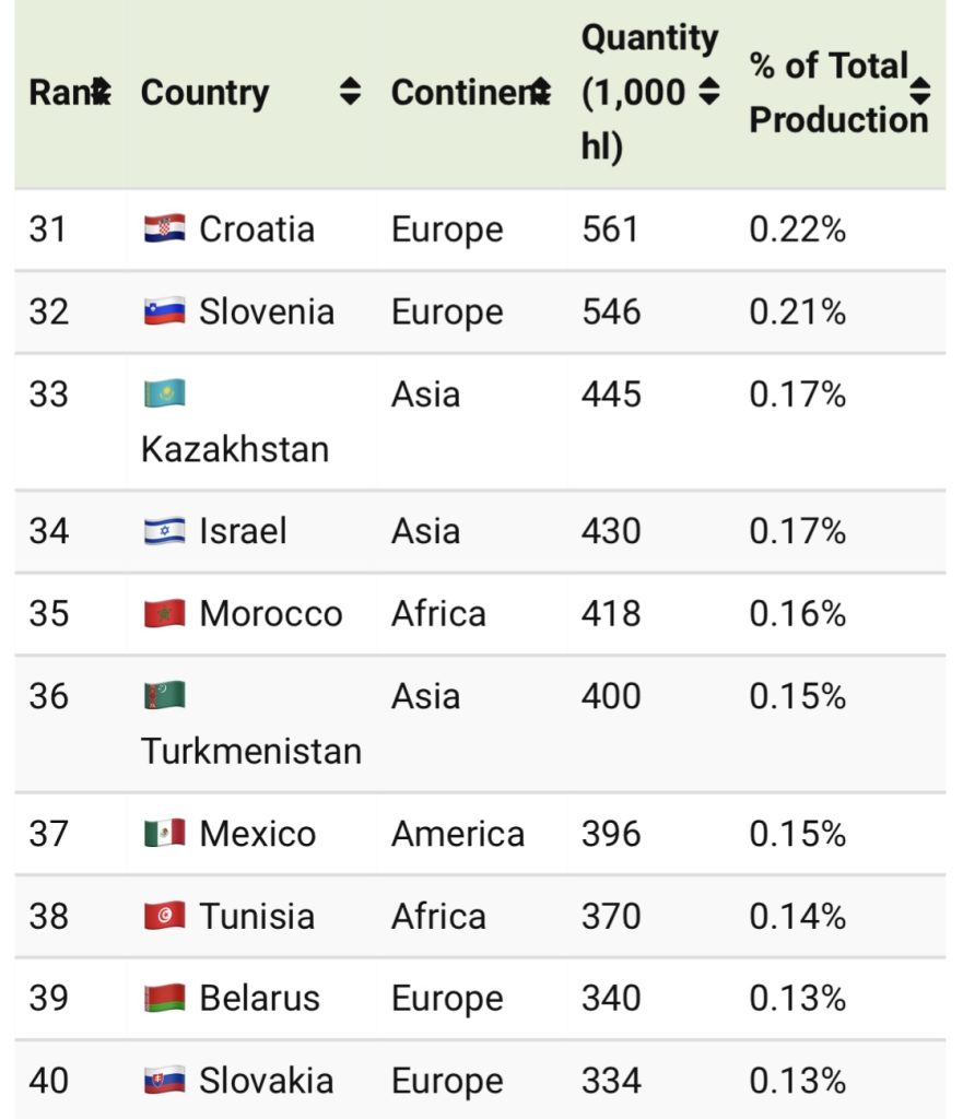 Meanwhile, China (ranked 14th) is the top wine producer from Asia. The region’s preference for other distilled spirits helps explain why the next two biggest Asian wine producers, Japan (25th) and Türkiye (31st) occupy the middle ranks.