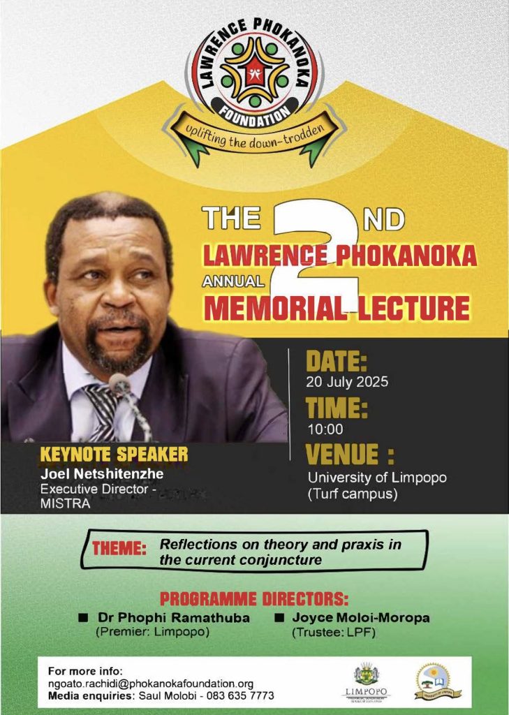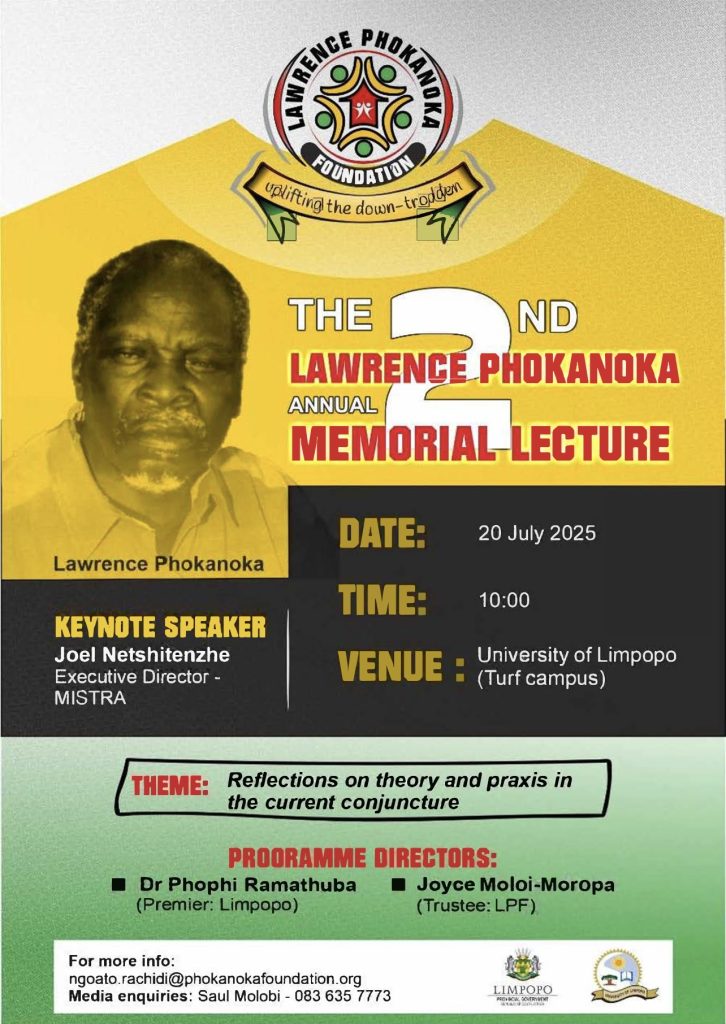 “Lawrence Phokanoka’s life reminds us that ideas must never exist in a vacuum – they must guide practical action. This lecture helps our society revisit his timeless insights and apply them to tackle today’s challenges, from economic inequality to social cohesion.”This year’s lecture marks the 20th anniversary of the passing of Comrade Lawrence “Phokes” Madimetja Phokanoka, a revered struggle stalwart, intellectual, and advocate for social justice. The event will serve as a platform to reflect on his enduring legacy and to engage in critical debate on contemporary socio-political challenges facing South Africa