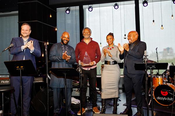 *** In the Photo: Hugh Masekela’s children, Selema Masekela and Pula Twala, and his nephew, Mabusha Masekela accept Ertegun Hall of Fame award on behalf of the late jazz musician from Seton Hawkins (Jazz at Lincoln Center) and Themba Khumalo (South African Tourism) ***