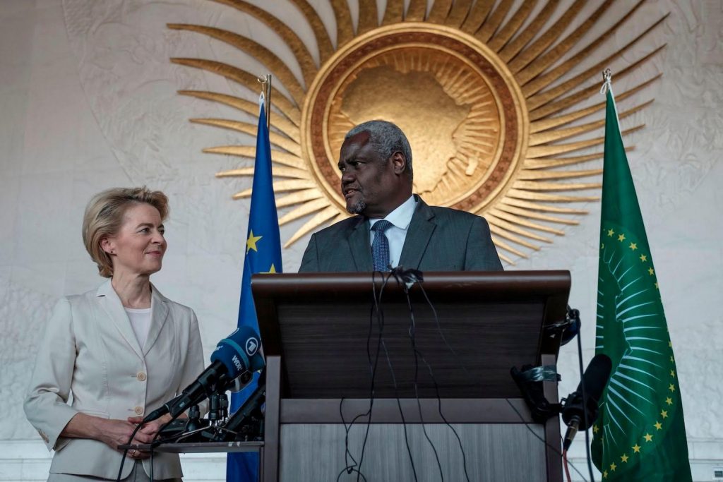 Chairperson of the African Union, Moussa Faki Mahamat speaks during a briefing to the press, next to the President of the European Commission, Ursula von der Leyen during her visit to the African Union in Addis Ababa, on December 7, 2019. (Photo by EDUARDO SOTERAS / AFP) (Photo by EDUARDO SOTERAS/AFP via Getty Images)